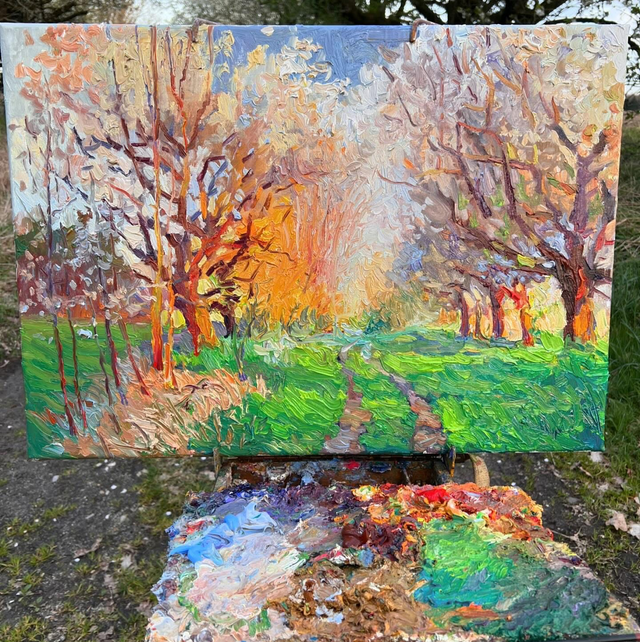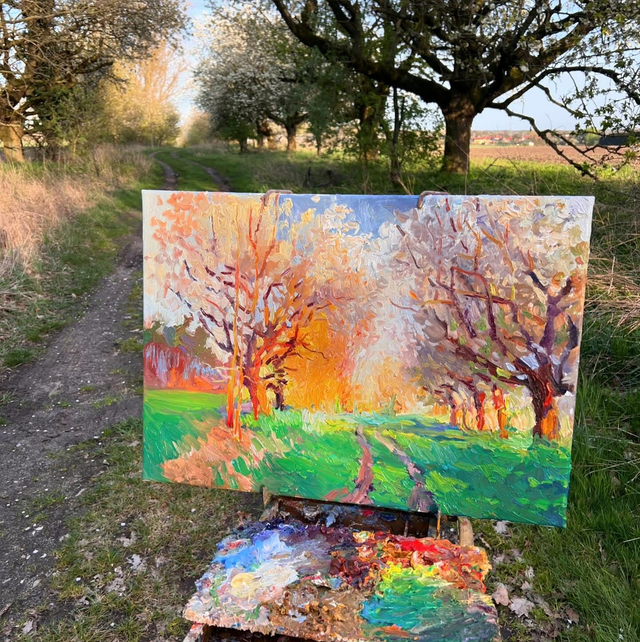 Ein lichter Frühlingstag entfaltet sich in voller Pracht. Die Obstbäume erstrahlen in zarten Weiß- und Rosatönen, während das frische Grün des Grases im Sonnenlicht leuchtet. Das Licht durchflutet die Szenerie und schafft einen Moment voller Lebendigkeit, Hoffnung und Erneuerung – eine poetische Hommage an den Zauber des Frühlings.