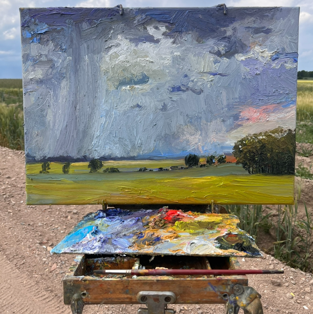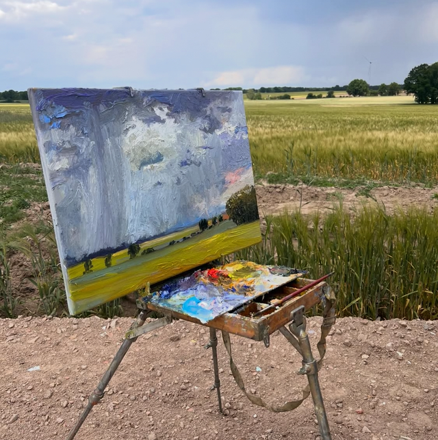 Schwere, dunkelblaue Wolken senken sich wie ein bleierner Schleier bis zum Horizont, während weiße Wolkenfetzen wie Watte darüber treiben. Zwischen den Feldern aus reifem Roggen ziehen sich Baumreihen, und am Rand stehen mächtige Eichen, deren Blätter dunkel glänzen wie gealtertes Kupfer. Hoch am Himmel erklingt der Gesang einer Lerche – ein Echo der Weite und Stille.
