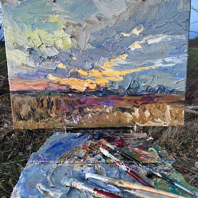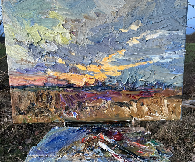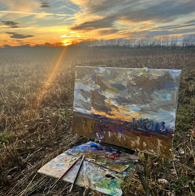 Ein ungewöhnlich warmer Januarabend hüllt die Landschaft in stille Ruhe. Am Horizont lodert der Himmel in einem leuchtenden Gelb, übergossen von Wellen aus Orange und Blau – ein Schauspiel der Farben zwischen Tag und Nacht.