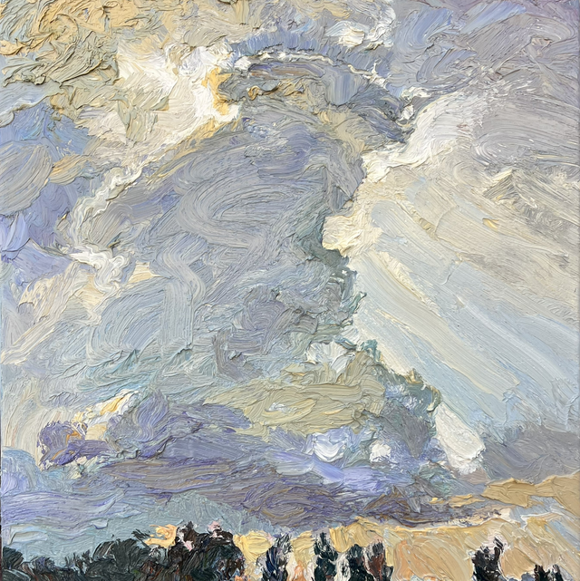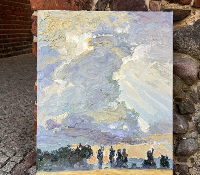 Eine gewaltige Wolke erhebt sich, verhüllt die Sonne und scheint wachsam zu warten. Pyramidenpappeln reihen sich durch die Roggenfelder und führen den Blick zum Waldrand. Unter ihren Kronen steigt Nebel aus den Spuren des letzten Regens. In der Ferne rollt Donner – ein Moment noch, und der nächste Schauer bricht los.