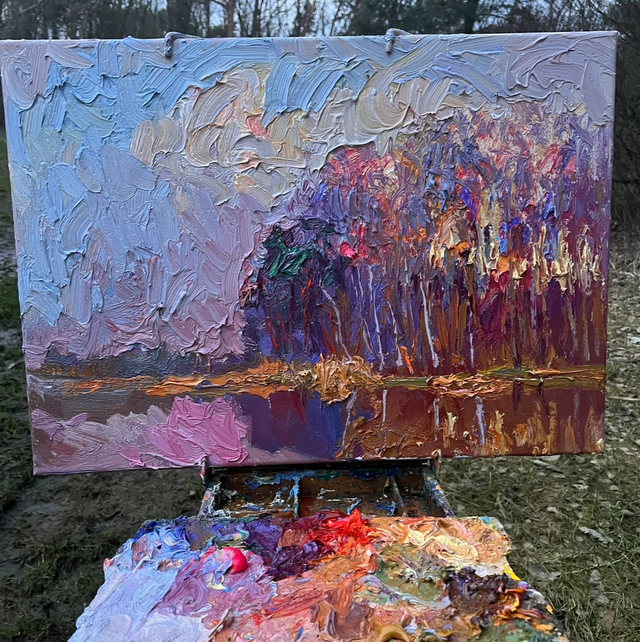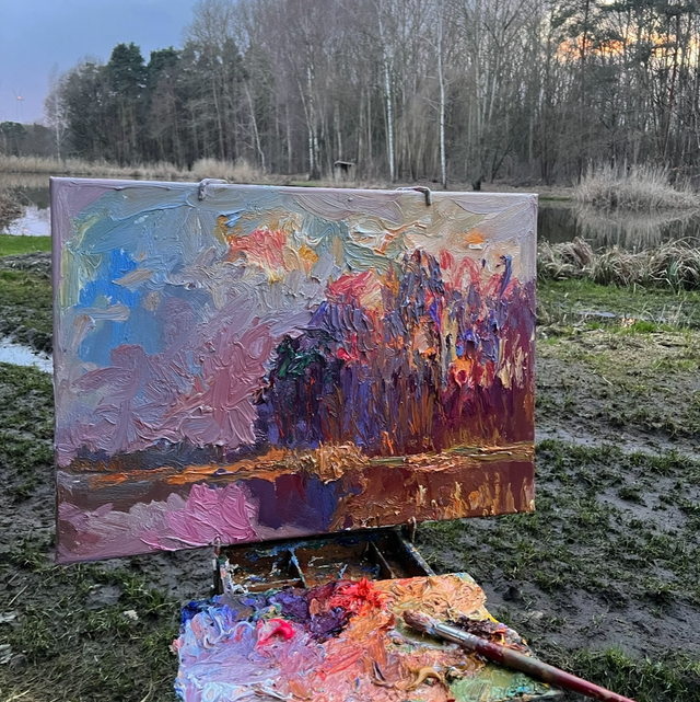 Original oil painting “Spring’s Etude by the Forest Lake”. Oil on canvas, 50 × 70 cm, 2024. A lyrical study of light, silence, and the arrival of spring.
