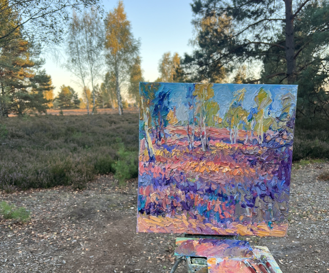 Dieses Werk entstand plein air in der Reicherskreuzer Heide – ein Moment zwischen Natur, Farbe und Erinnerung, eingefangen im Rhythmus lebendiger Pinselstriche.