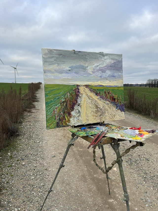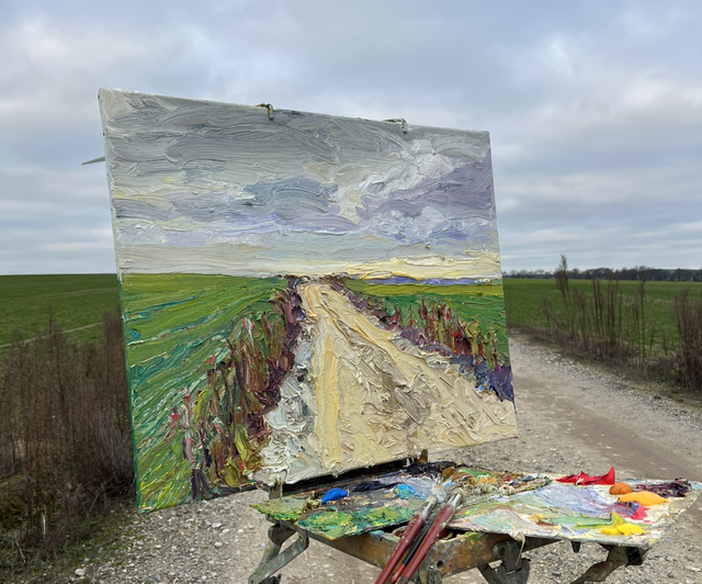Ein breiter Feldweg führt zum Horizont; links und rechts stehen Melden wie stille Zeugen der Zeit.